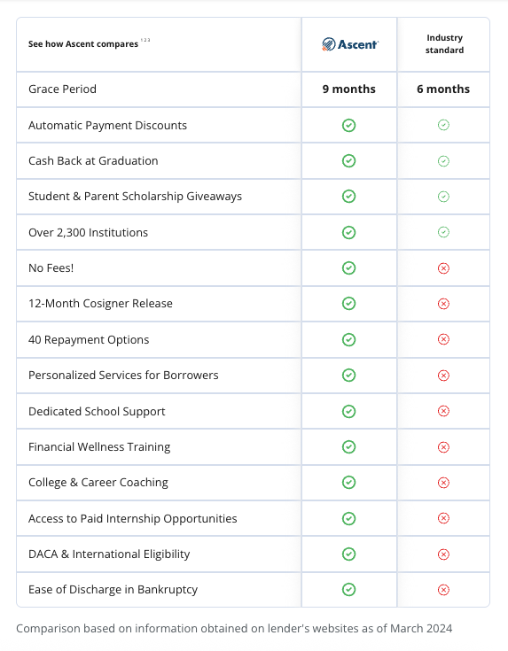 Interested in seeing how Ascent compares to other lenders? Check out our comparison chart below and discover the benefits we offer to support your students.